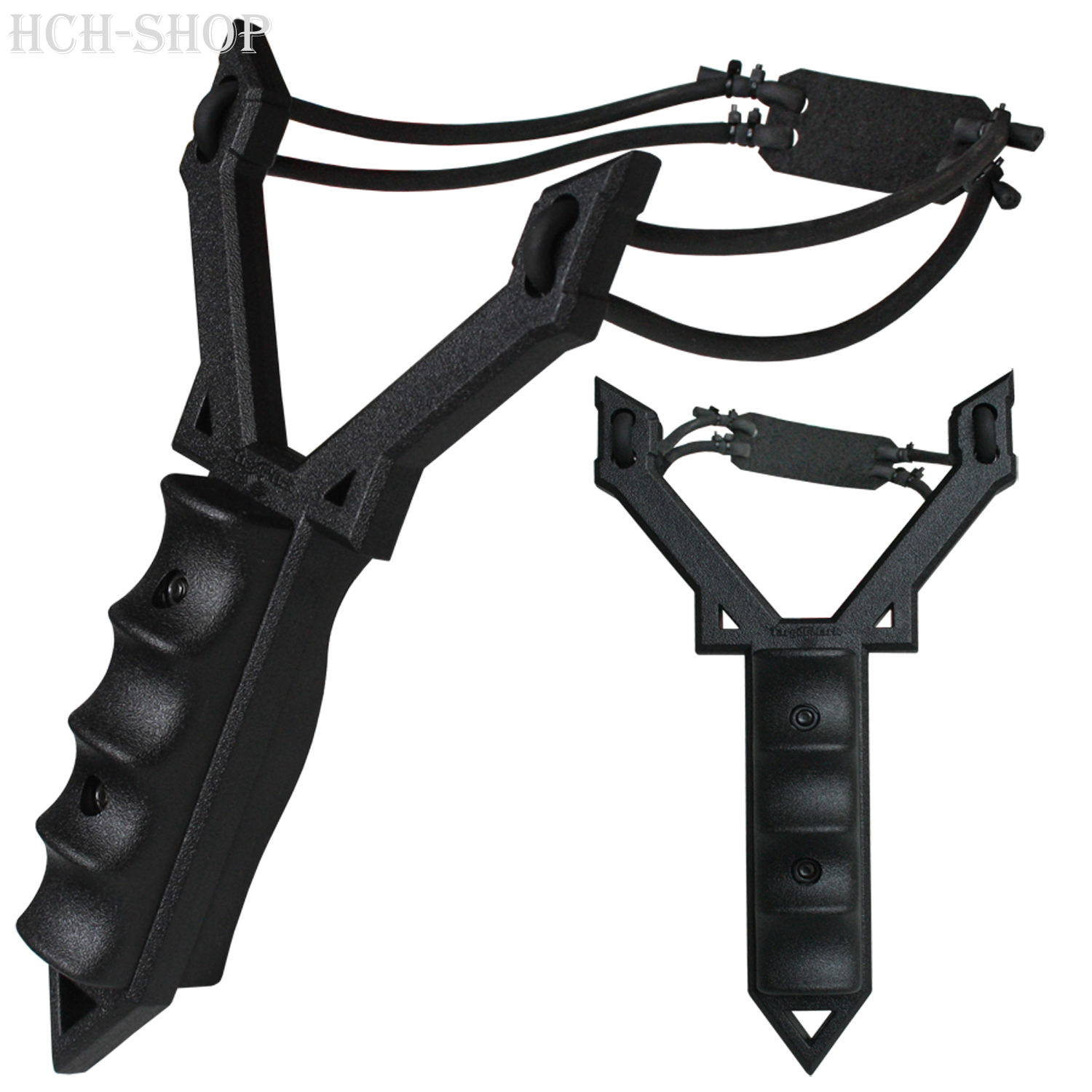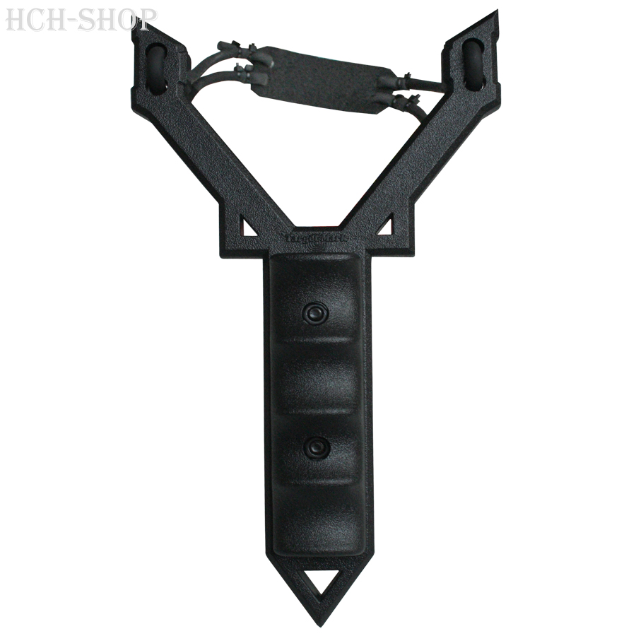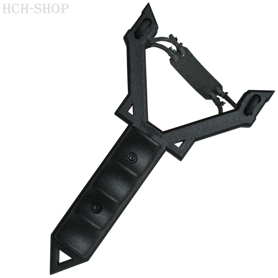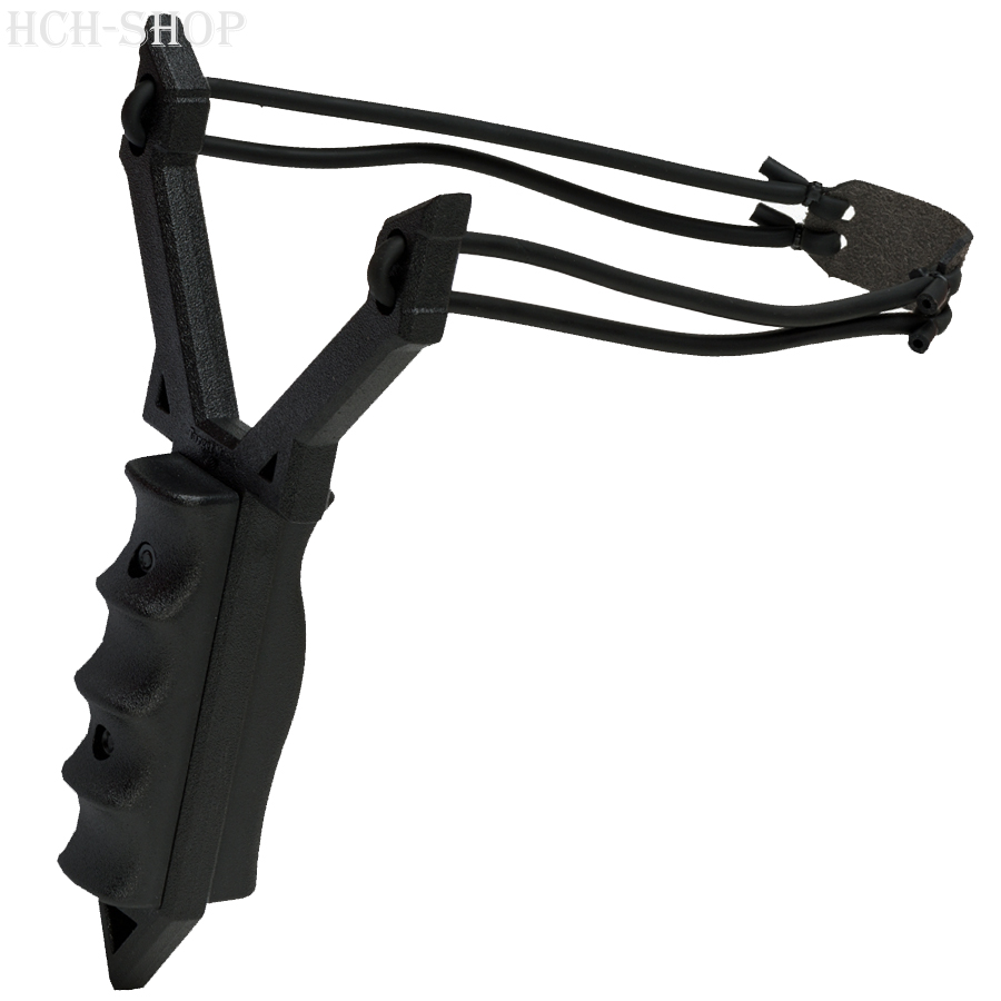 Schwarze Schleuder im aussergewönlichem Design mit griffigen, robusten Kunststoffgriff. Quad String Technologie.