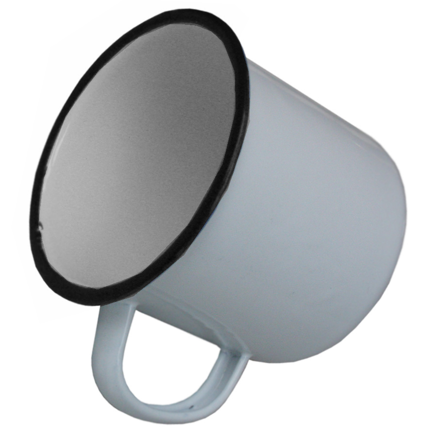 Formschöne Emaille-Tasse mit Henkel, weiß mit schwarzen Rand.