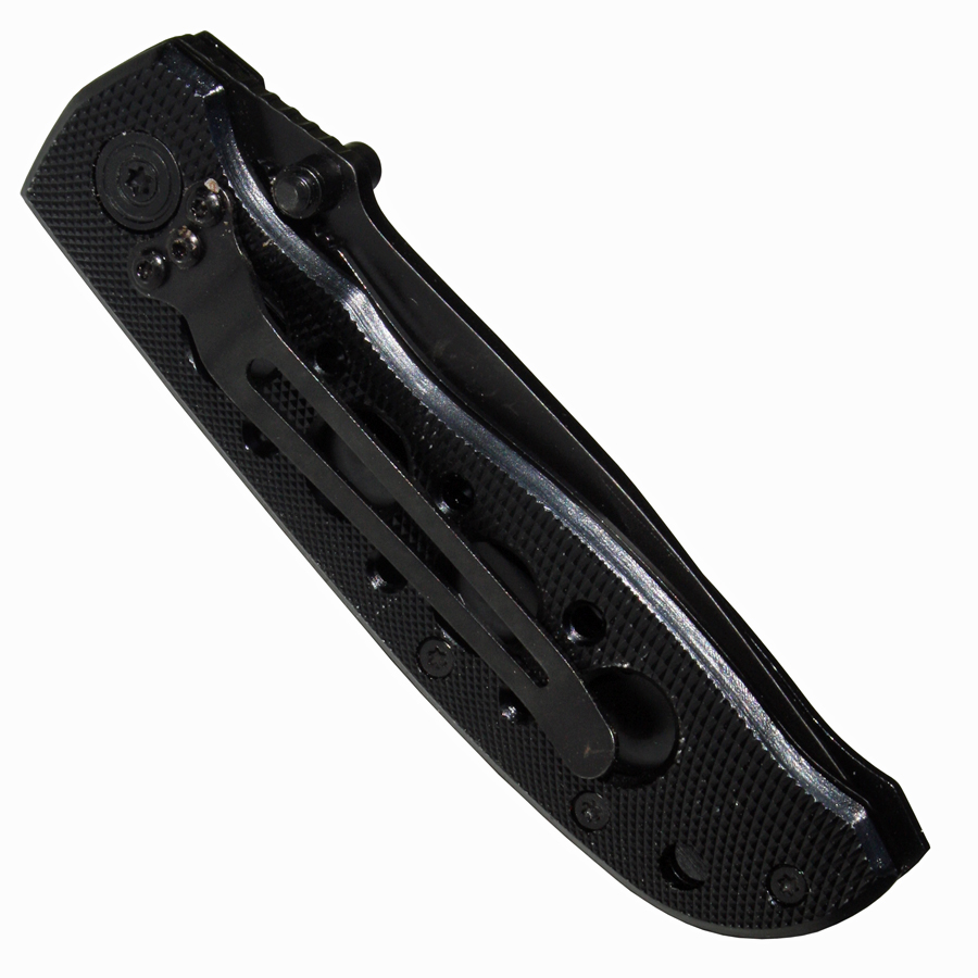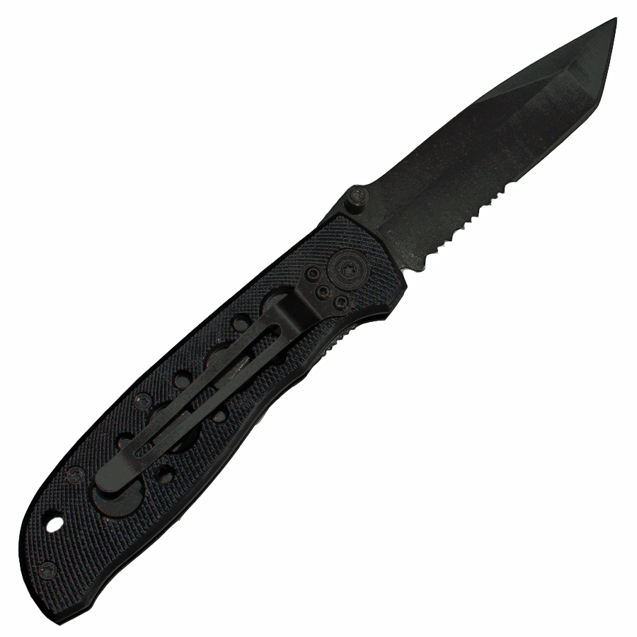 Die schwarz beschichtete Tantoklinge ist aus 7CR17 rostfreiem Stahl und hat einen halben Wellenschliff, die Griffbeschalung ist aus Leichtmetall.