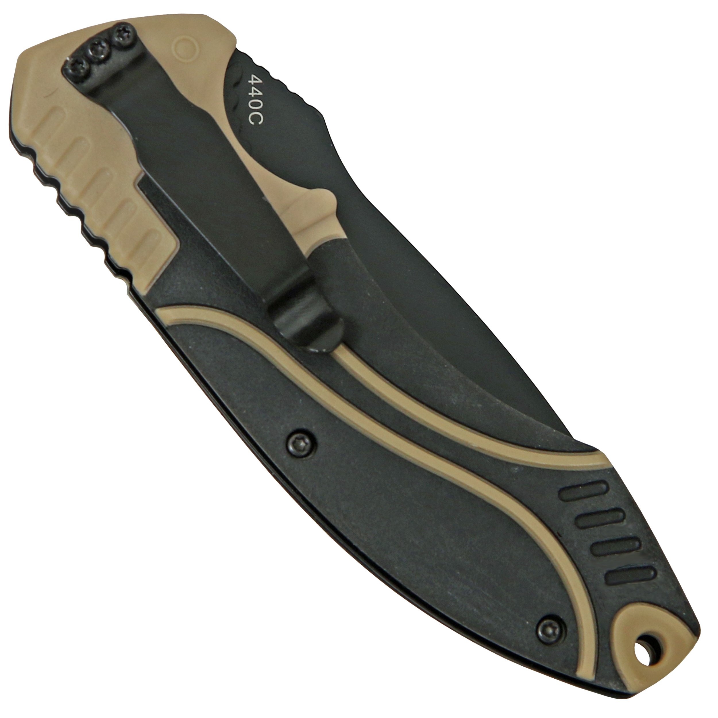 A wide, black-coated clip for tip-down carrying keeps the knife in position within easy reach.