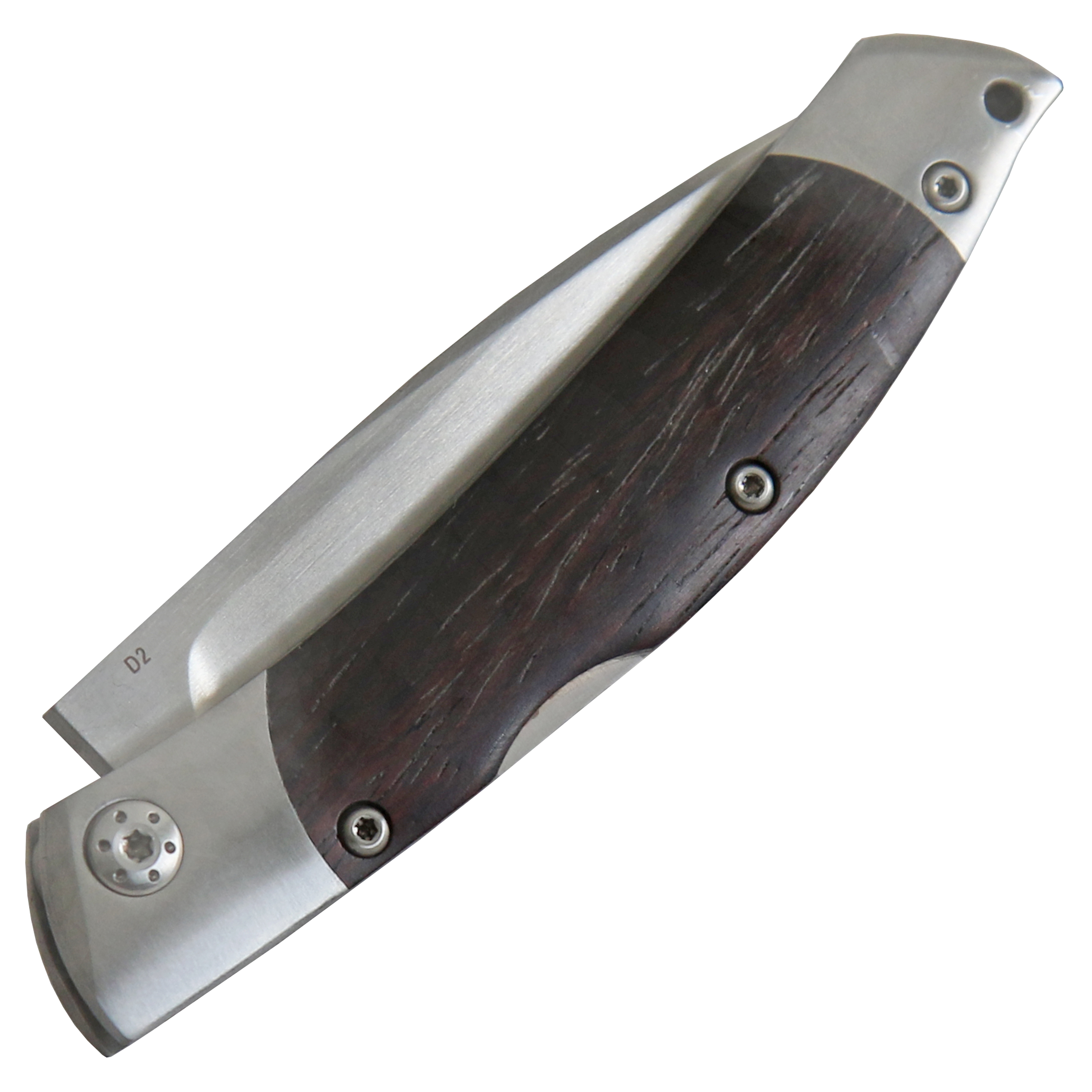 Brushed stainless steel bolsters and dark cocobolo wood scales complete the features