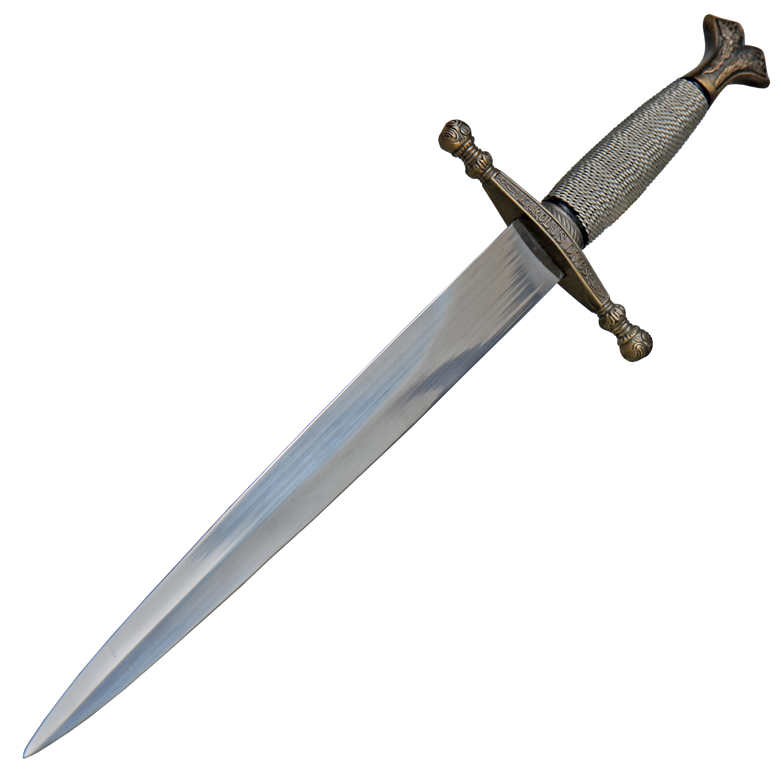 The dagger handle with its decorated elements is made of metal, the corresponding