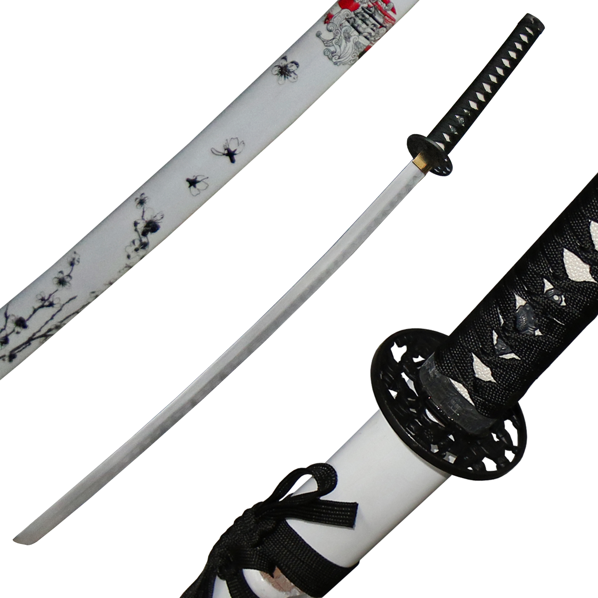 The accompanying wooden scabbard/saya is painted white, one side is decorated with flowers/blossoms