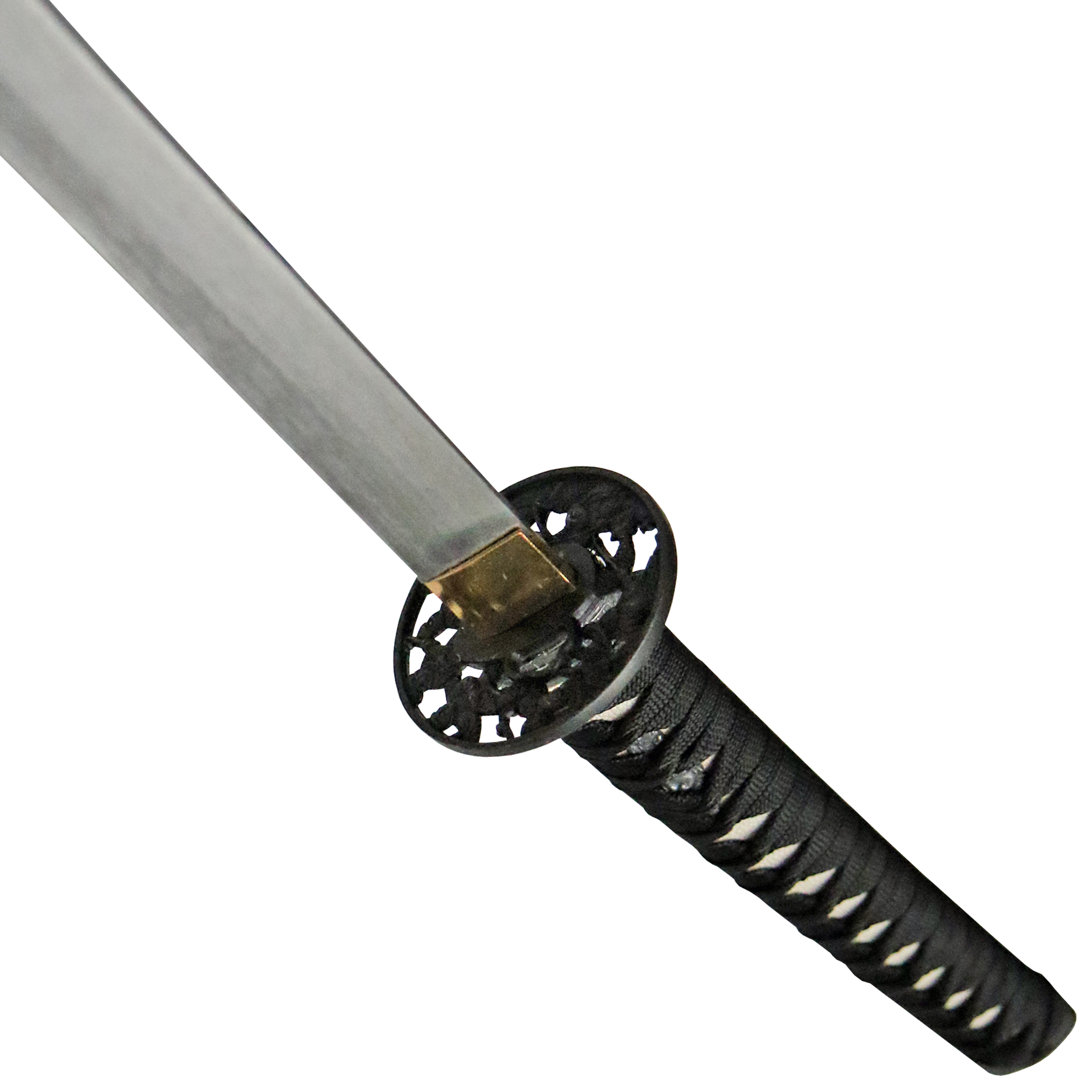 The samurai sword handle is traditionally wrapped with a black ribbon, the tsuba