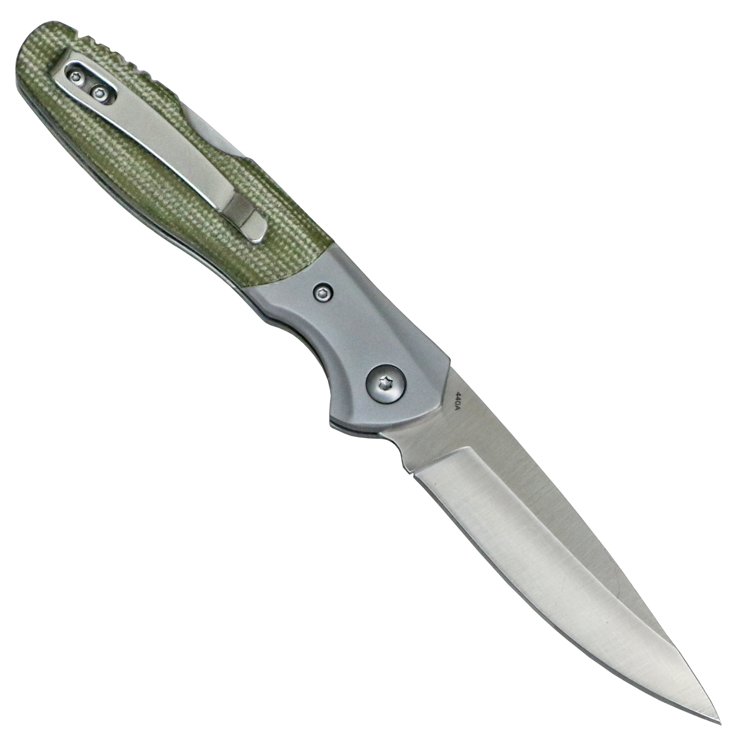 The satin-finished 440A blade with hollow grind is opened with a nail nick and securely